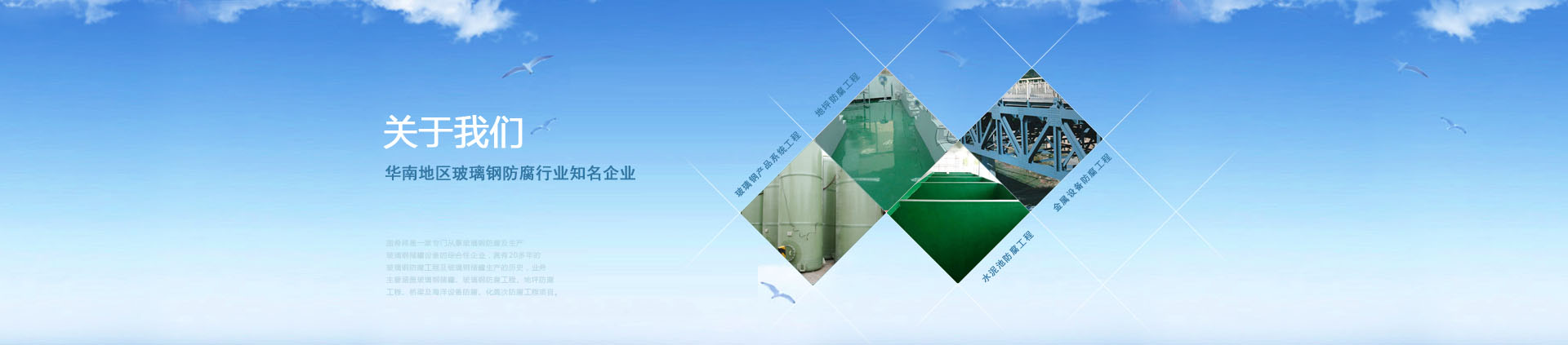 廣州市固希祥防腐工程有限公司是一家專門從事玻璃鋼防腐及生產(chǎn)玻璃鋼儲罐設(shè)備的綜合性企業(yè),具有20多年的防腐工程施工歷史,三大核心業(yè)務(wù):玻璃鋼防腐施工、油漆防腐施工、玻璃鋼儲罐等制品生產(chǎn)。內(nèi)容涵蓋玻璃鋼儲罐、玻璃鋼防腐工程、地坪防腐工程、水泥池防腐工程、大中型廠房翻新工程、工程機械翻新、各類新舊設(shè)備的油漆噴涂及金屬設(shè)備防腐工程項目。公司致力于防腐工程的技術(shù)研究和工程施工;擁有150多名10年左右玻璃鋼防腐施工經(jīng)驗的技術(shù)工人,可以快速,高質(zhì)量完成客戶的需求。